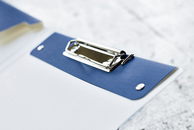 Zur flexiblen Befestigung von Schreibunterlagen (Notizblock) können Blockleisten in Präsentationsprodukte eingearbeitet werden. Bei Bedarf kann an vorgesehener Stelle der Block eingehängt oder herausgenommen werden.