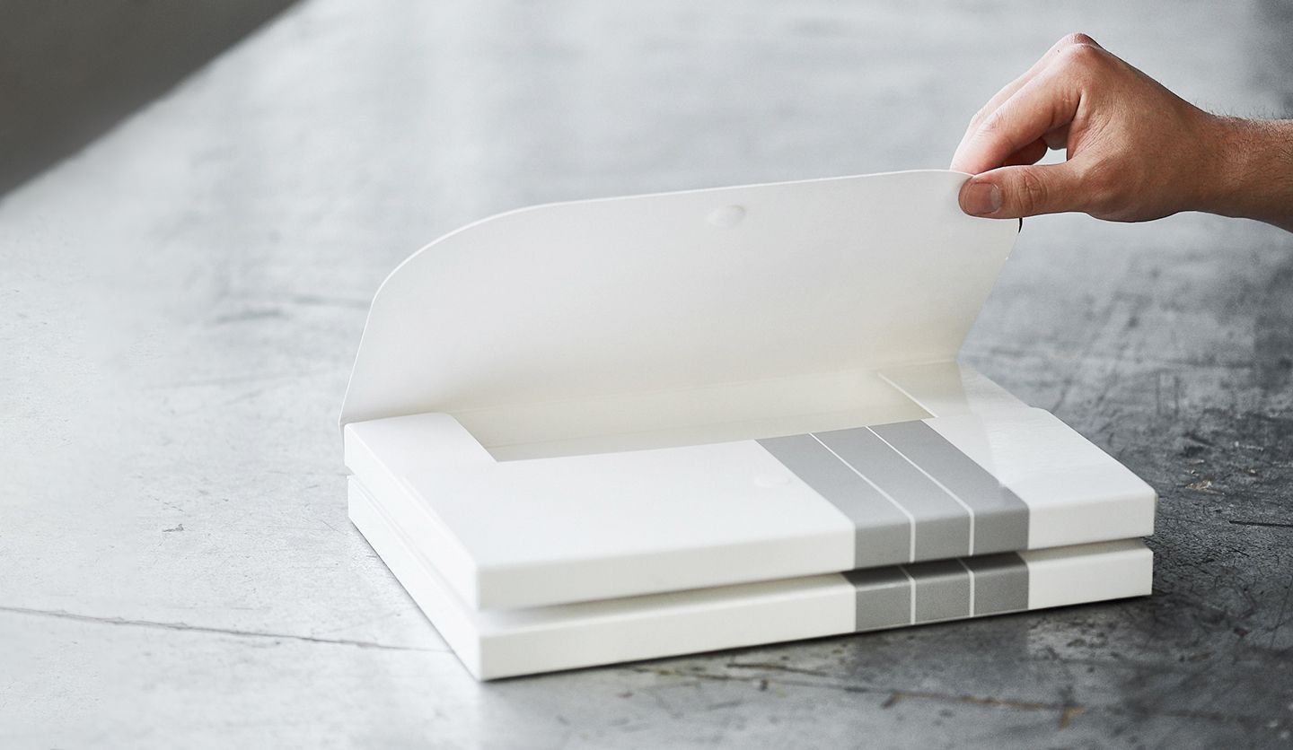 Die Karton-Doku-Box ist ebenso in diversen Füllhöhen für das Einlegeformat DIN A5 erhältlich. In diesem Fall verwenden wir jedoch einen 530 g/m² Chromo-Sulfatkarton.