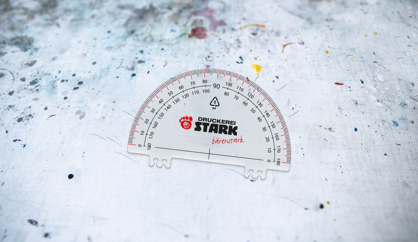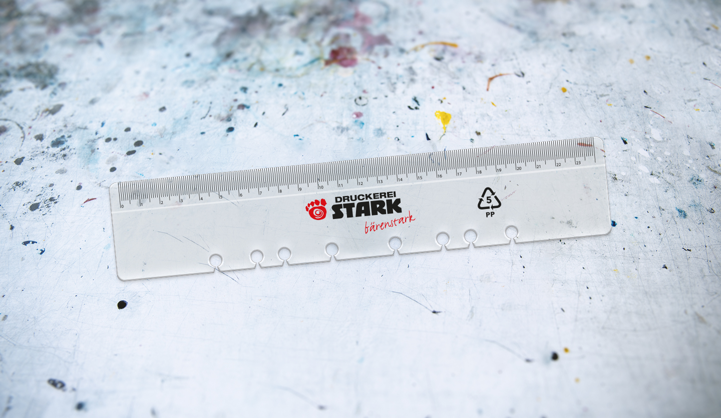 Polypropylen lässt sich ein- bzw. beidseitig, ein- oder mehrfarbig in Skalen- sowie HKS- und Pantonefarben bedrucken und ist resistent gegen Schmutz und Wasser. Die PP-Lineale sind dadurch einfach zu reinigen, sehr langlebig und ein echter Hingucker. Unsere PP-Lineale und Winkelmesser sind sowohl transluzent als auch weiß opak (blickdicht) bzw. in verschiedenen Färbungen erhältlich. Soll das Lineal Lösungsmittelresistent sein, empfehlen wir als zusätzlichen Oberflächenschutz eine Mattfoliencellophanierung.