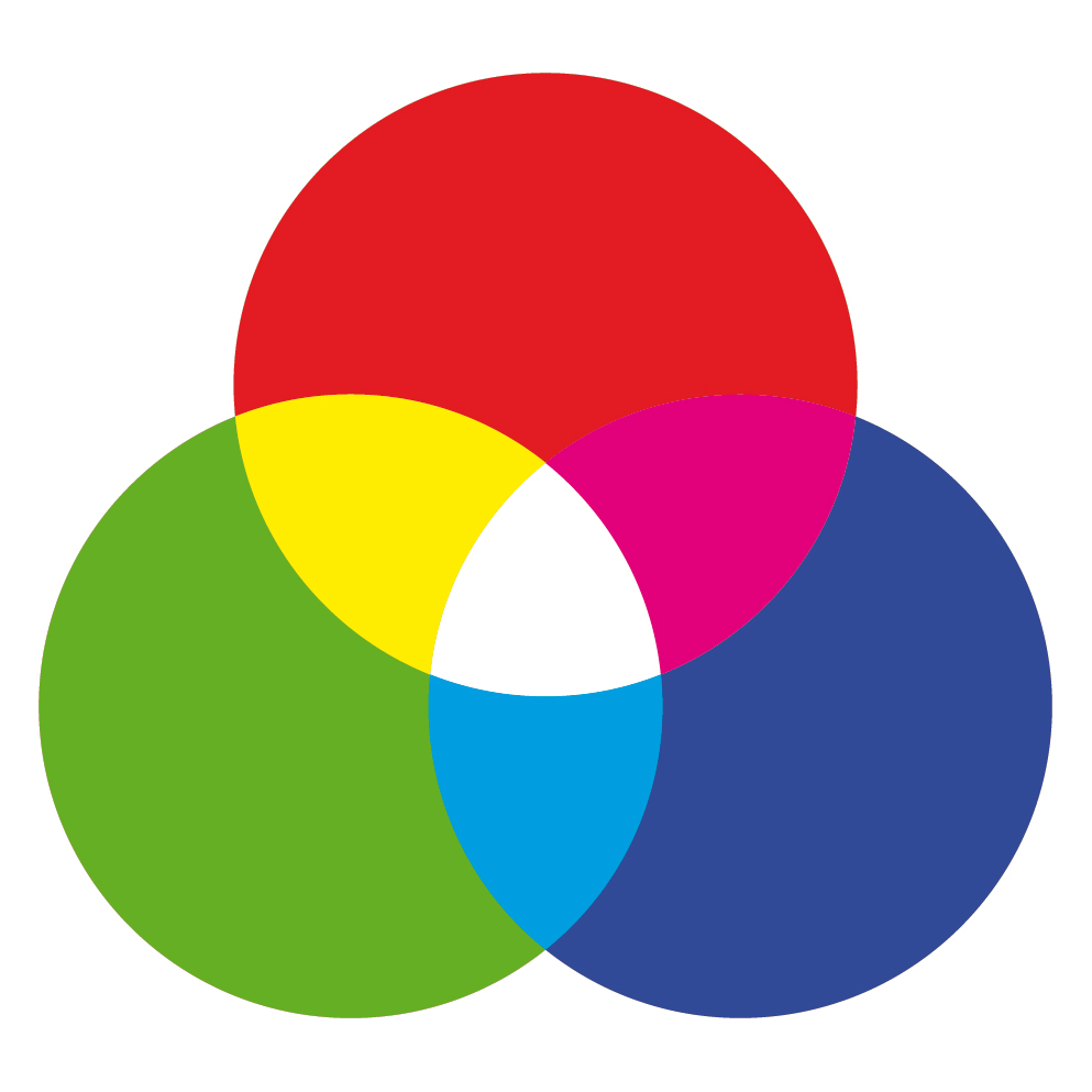 | Wenn Licht verschiedener Farben auf dieselbe Stelle gelenkt wird und sich optisch überlagert (addiert), spricht man von einer additiven Farbmischung. Mischt man die additiven Grundfarben Rot, Grün und Blau (auch Eindrittelfarben genannt, da sie jeweils ein Drittel des Spektrums darstellen), addieren sich die Wellenbereiche zu neuen Farben (Grün + Rot = Gelb, Blau + Grün = Cyan, Rot + Blau = Magenta). Je nach Intensität der gemischten Grundfarben können alle Farben gemischt werden. Das Gehirn nimmt über Farbreize im Auge die Farbe Weiß wahr, wenn alle Farben des Spektrums in gleicher Intensität sichtbar sind. | |