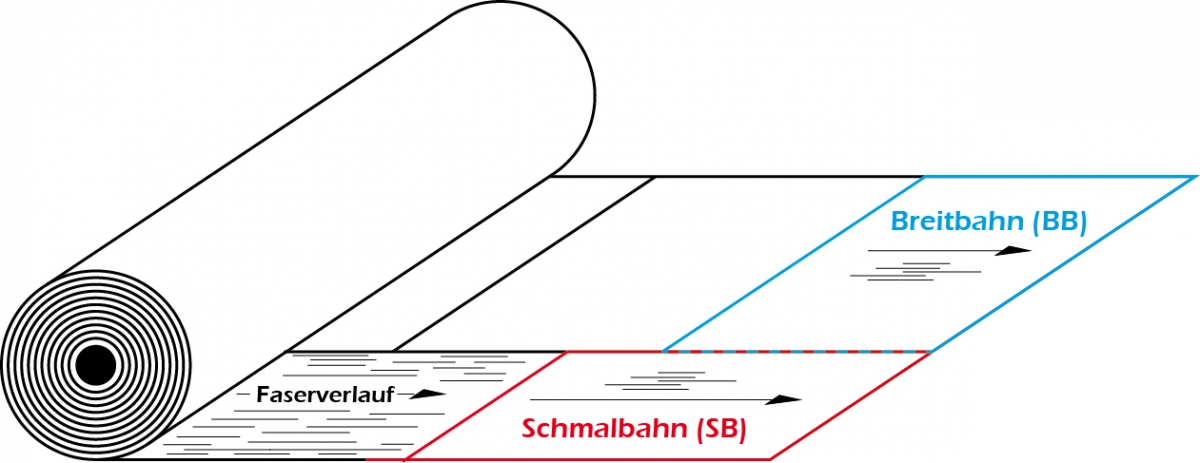Wenn ein Druckbogen aus der Länge der Papierbahn geschnitten wird, spricht man von einer Schmalbahn. Ob es sich beim vorliegenden Papier um ein Schmalbahn- oder Breitbahnpapier handelt, lässt sich anhand einer Reißprobe feststellen: das Papier wird quer und längs eingerissen, der glatteste Riss zeigt die Laufrichtung an.