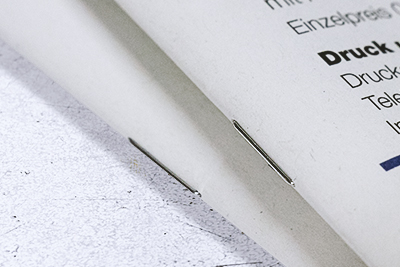 | Bei der Rückendrahtheftung werden die einzelnen Seiten des Druckproduktes von zwei Klammern mittig zusammengehalten. Die Rückendrahtheftung eignet sich für Druckprodukte mit kleinerer Seitenanzahl. Siehe auch Ringösenheftung. | |