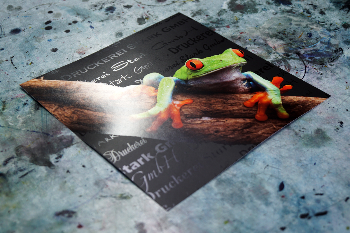 Partielle Lackierung mit UV-Lack, um Akzente zu setzen oder Elemente hervorzuheben. Mehr siehe UV-Lackierung im Glossar oder im Bereich Druckveredelung unter UV-Spotlackierung.