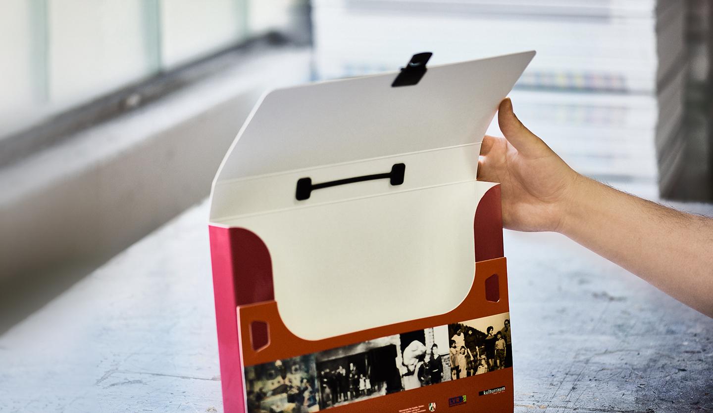 Unser Karton-Koffer besteht aus einem Vollkarton mit einem Flächengewicht von 1000 g/m², welcher im Offset bedruckt und anschließend verarbeitet wird. Die außergewöhnliche Stabilität unserer Produkte bietet vielseitige Einsatzmöglichkeiten sowie einen dauerhaften Nutzen.