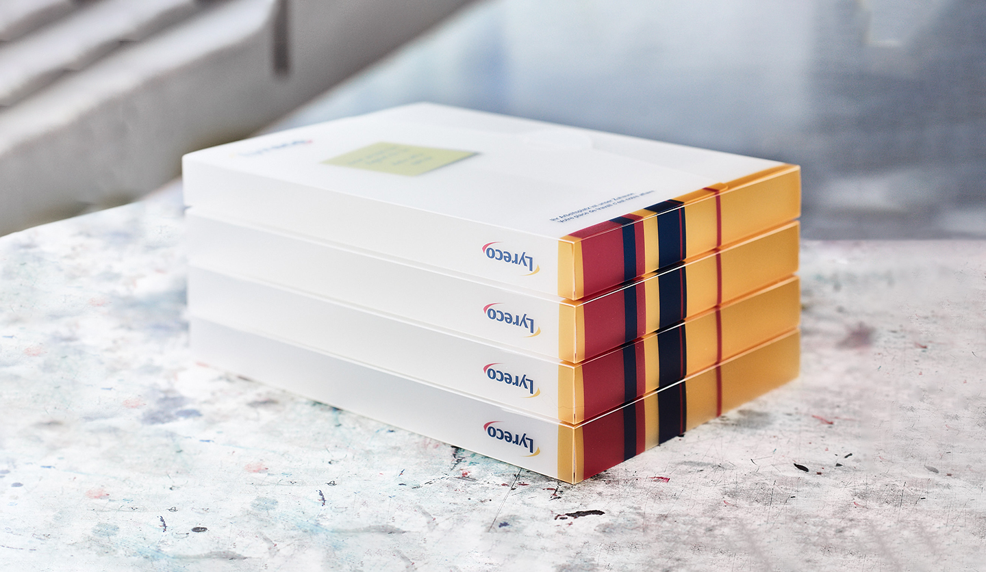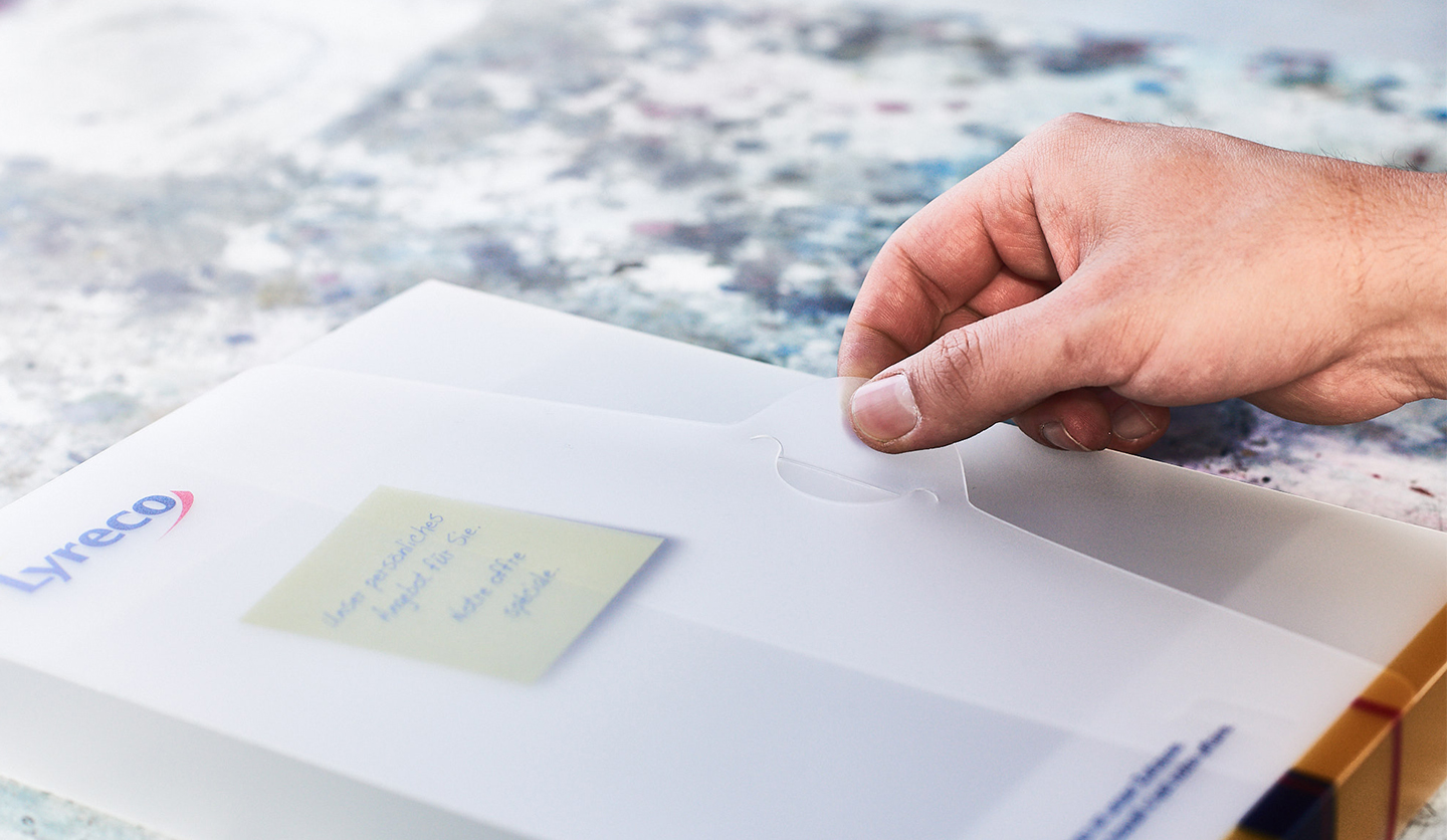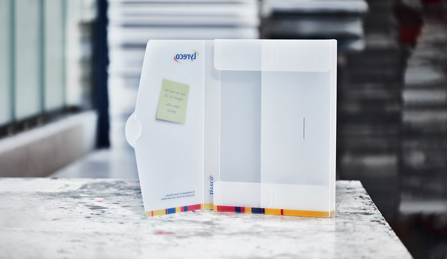 Das transluzente Polypropylen lässt sich einseitig, ein- oder mehrfarbig in Skalen- sowie HKS- und Pantonefarben bedrucken und ist resistent gegen Schmutz und Wasser. Die Mappen sind einfach zu reinigen, langlebig und durch die durchscheinende Optik ein echter Hingucker. Das Polypropylen ist sowohl transluzent als auch weiß opak (blickdicht) bzw. in verschiedenen Färbungen erhältlich. Opake Materialien lassen sich grundsätzlich auch beidseitig bedrucken. Soll die Mappe Lösungsmittelresistent sein, empfehlen wir als zusätzlichen Oberflächenschutz eine Mattfoliencellophanierung. Für den besonderen Effekt können wir auf Polypropylen ebenso Heißfolienprägungen aufbringen.