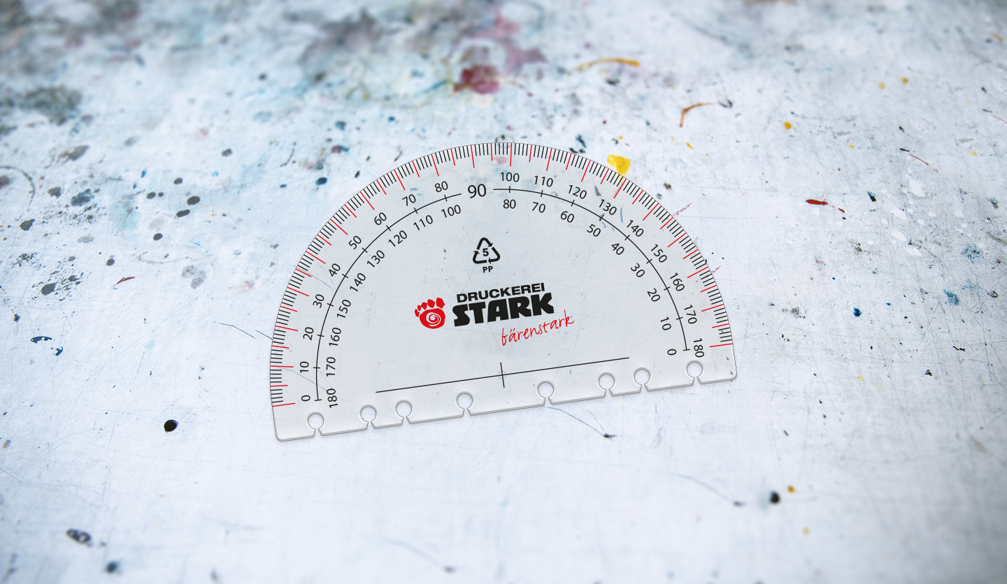 Polypropylen lässt sich ein- bzw. beidseitig, ein- oder mehrfarbig in Skalen- sowie HKS- und Pantonefarben bedrucken und ist resistent gegen Schmutz und Wasser. Die PP-Lineale sind dadurch einfach zu reinigen, sehr langlebig und ein echter Hingucker. Unsere PP-Lineale und Winkelmesser sind sowohl transluzent als auch weiß opak (blickdicht) bzw. in verschiedenen Färbungen erhältlich. Soll das Lineal Lösungsmittelresistent sein, empfehlen wir als zusätzlichen Oberflächenschutz eine Mattfoliencellophanierung.