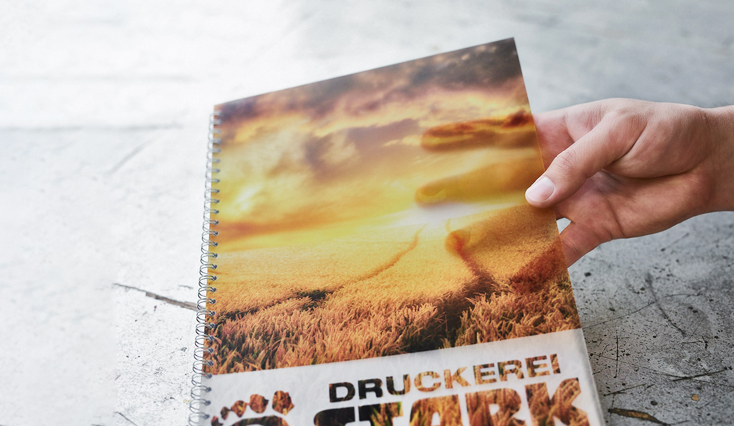 Ausführung mit 0,5 mm starkem PP und 80 g/m² Offsetpapier als Inhalt. Standardmäßig mit 50 Blatt Inhalt ausgestattet. Mit Wire-O-Bindung und Perforation entlang der Spiralbindung. Optional mit einer 2- oder 4-fach Abheftlochung sowie ein zusätzliches Deckblatt.